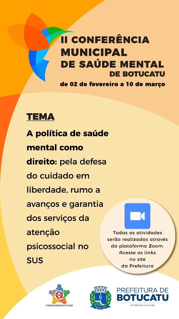 O Conselho Municipal de Saúde realiza a II Conferência Municipal de Saúde Mental de Botucatu (II CMSMB), a partir do próximo dia 02 de fevereiro. O evento, que terá sua Plenária Final nos dias 09 e 10 de março e será norteada pelas diretrizes do Documento Norteador da 5ª Conferência Nacional de Saúde Mental (5ª CNSM).