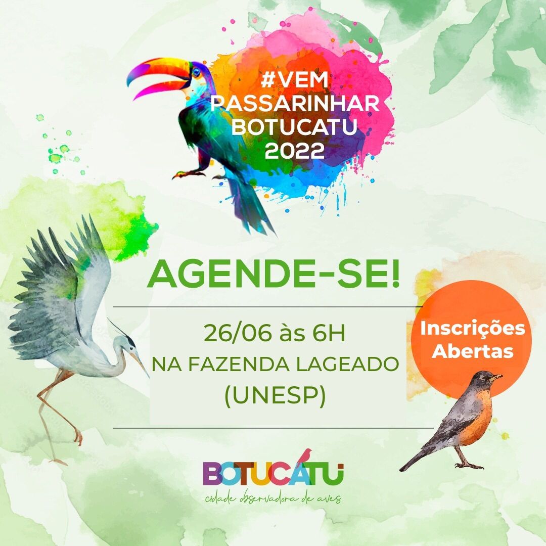 No próximo sábado, 26, será realizada a 4ª edição do "Vem Passarinhar em Botucatu", evento realizado pela Secretaria Adjunta de Turismo, que promove a observação de aves pela Cuesta. São apenas 20 vagas e as inscrições vão até dia 24 de junho ou até o preenchimento das vagas.